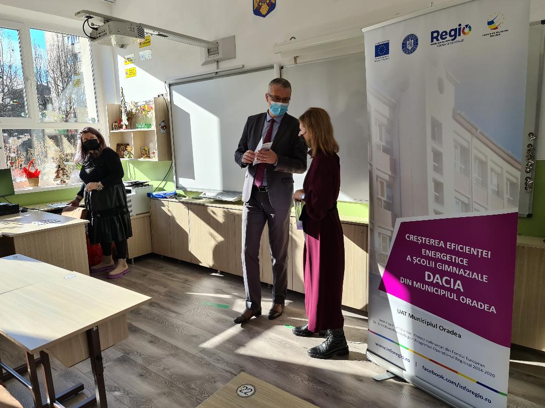 Vineri, 28 ianuarie 2022, a avut loc la Școala Dacia din Oradea conferința de finalizare a implementării proiectului cu titlul „CREȘTEREA EFICIENȚEI ENERGETICE A ȘCOLII GIMNAZIALE DACIA DIN MUNICIPIUL ORADEA”, în cadrul Programului Operațional Regional (POR) 2014-2020, Axa prioritară 3 – Prioritate de investiții 3.1 Sprijinirea eficienței energetice, a gestionării inteligente a energiei și a utilizării energiei din surse regenerabile în infrastructurile publice, inclusiv în clădirile publice, și în sectorul locuințelor, Operațiunea B Clădiri publice, proiect co-finanțat prin Fondul European de Dezvoltare Regională, în baza contractului de finanțare încheiat cu Ministerul Dezvoltării Regionale și Administrației Publice și Agenția de Dezvoltare Regională Nord-Vest, cod SMIS 115132.