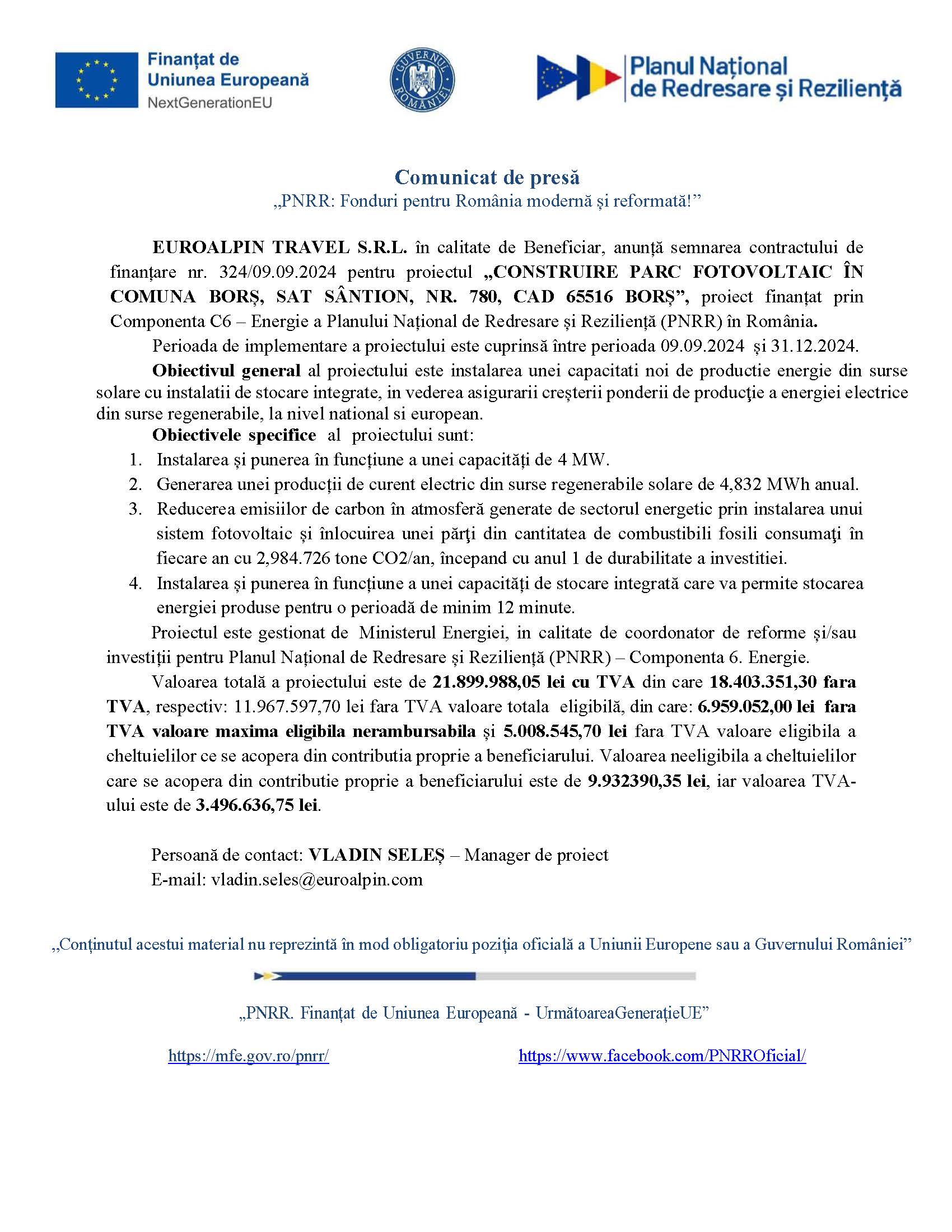EUROALPIN TRAVEL S.R.L. în calitate de Beneficiar, anunță semnarea contractului de finanțare nr. 324/09.09.2024 pentru proiectul „CONSTRUIRE PARC FOTOVOLTAIC ÎN COMUNA BORȘ, SAT SÂNTION, NR. 780, CAD 65516 BORȘ”, proiect finanțat prin Componenta C6 – Energie a Planului Național de Redresare și Reziliență (PNRR) în România.