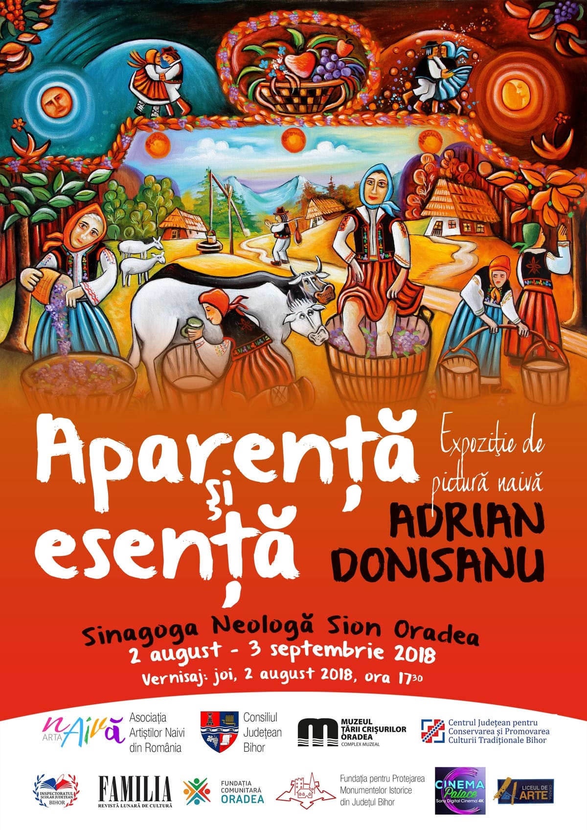 Arta naivă rezonează din nou, ca în fiecare an în această perioadă, cu sufletele orădenilor, prin expoziţia „Aparenţă şi esenţă” a pictorului naiv Adrian Donisanu, aflată pe simezele Sinagogii Neologe Sion, spaţiu cultural neconvenţional. Pînzele expuse sunt parte dintr-un permanent joc, în care aparenţa este uneori esenţă şi invers.