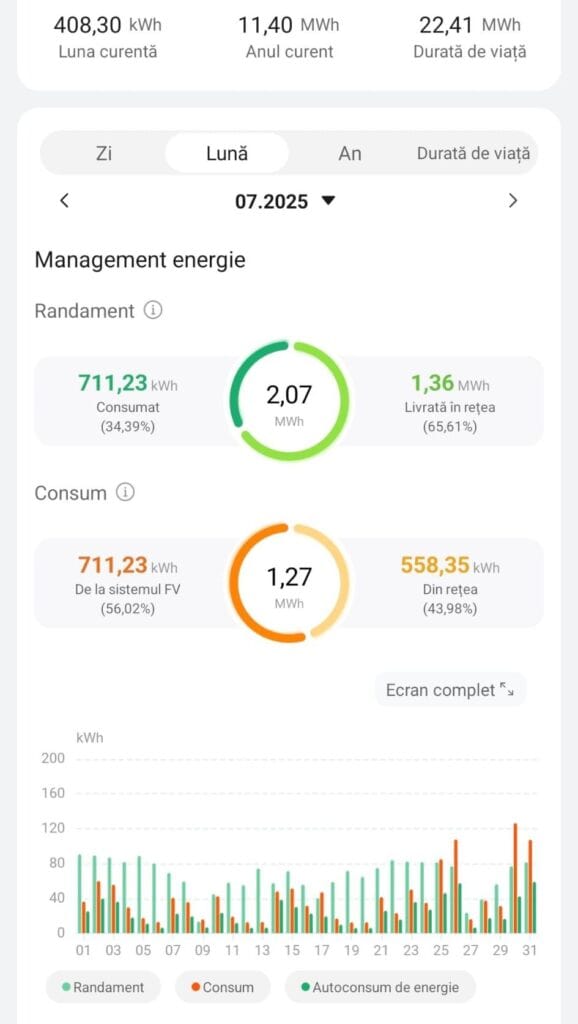 - 711,23 kWh au fost consumați direct în locație (autoconsum),