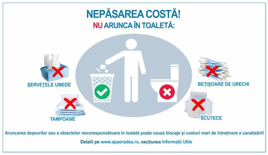 Compania de Apă Oradea (CAO) a demarat o amplă campanie de informare a populației intitulată „Nepăsarea costă!”, menită să atragă atenția asupra consecințelor grave pe care le are aruncarea deșeurilor în toaletă asupra rețelei publice de canalizare.