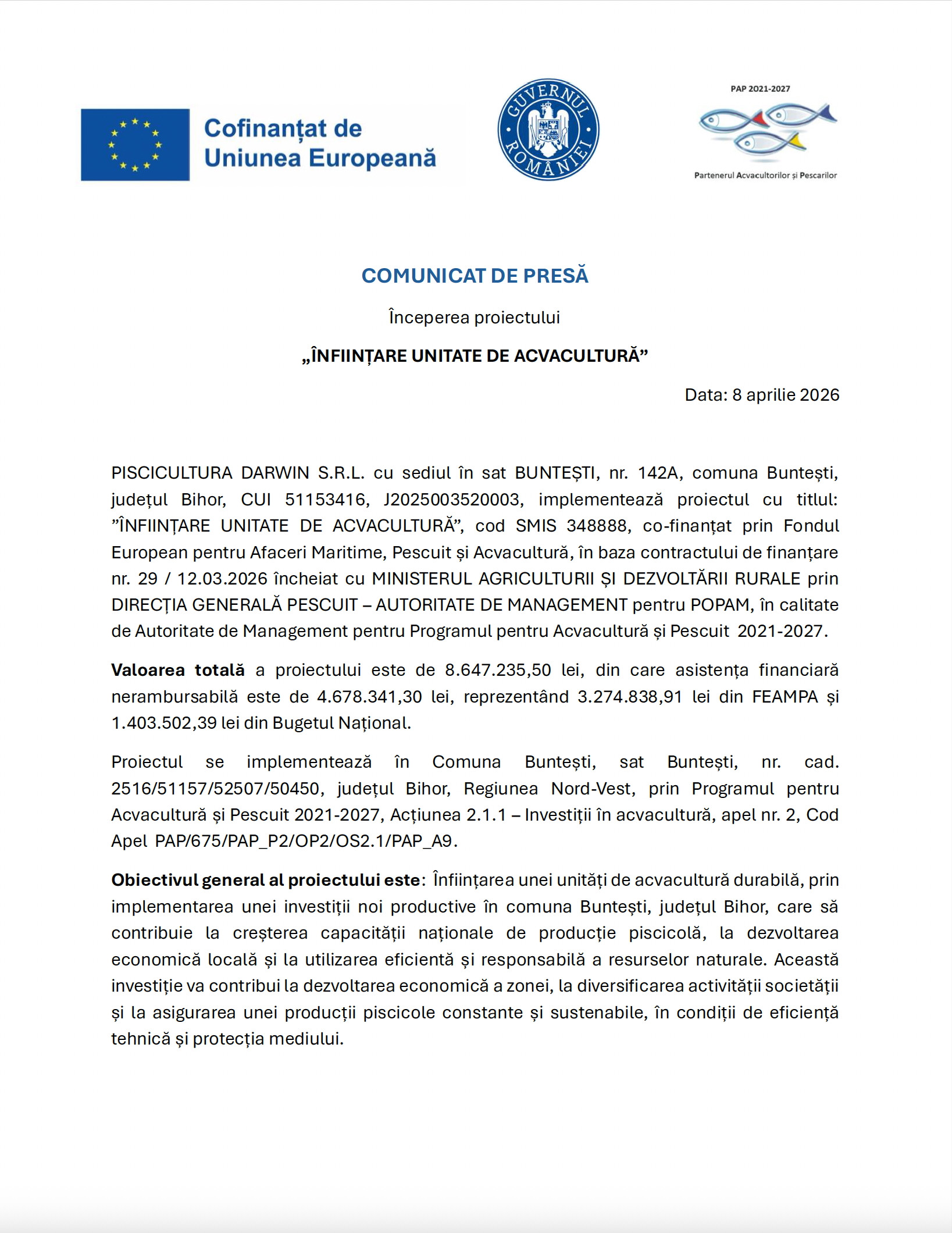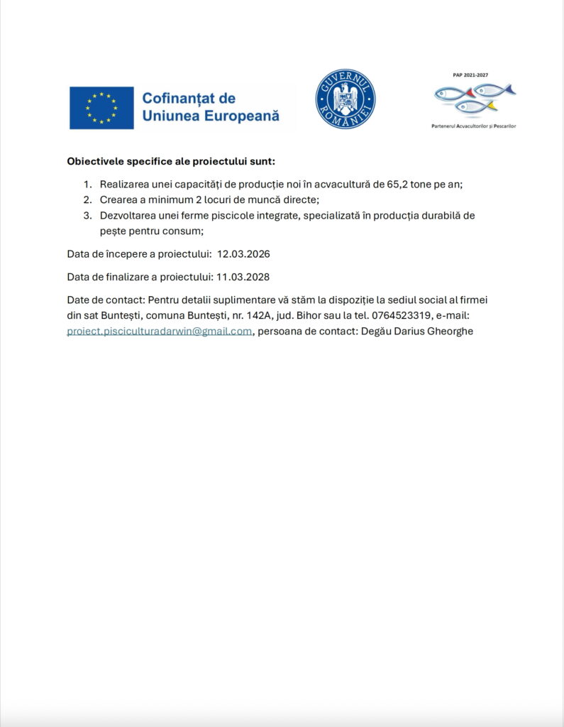 PISCICULTURA DARWIN S.R.L. cu sediul în sat BUNTEȘTI, nr. 142A, comuna Buntești, județul Bihor, CUI 51153416, J2025003520003, implementează proiectul cu titlul: ”ÎNFIINȚARE UNITATE DE ACVACULTURĂ”, cod SMIS 348888, co-finanțat prin Fondul European pentru Afaceri Maritime, Pescuit și Acvacultură, în baza contractului de finanțare nr. 29 / 12.03.2026 încheiat cu MINISTERUL AGRICULTURII ȘI DEZVOLTĂRII RURALE prin DIRECȚIA GENERALĂ PESCUIT – AUTORITATE DE MANAGEMENT pentru POPAM, în calitate de Autoritate de Management pentru Programul pentru Acvacultură și Pescuit 2021-2027.