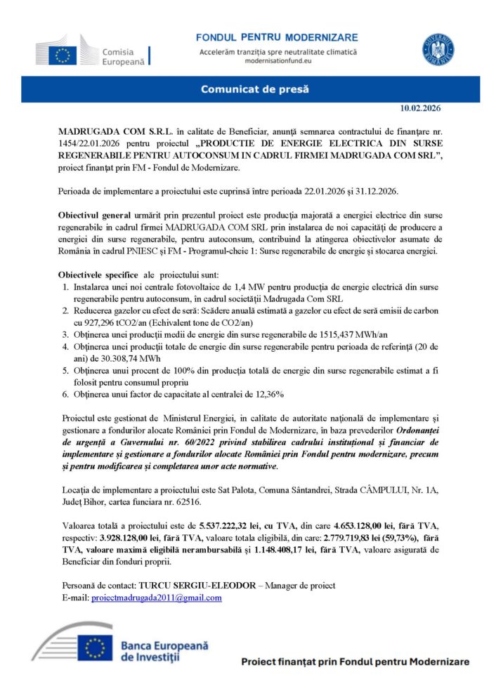MADRUGADA COM S.R.L. în calitate de Beneficiar, anunță semnarea contractului de finanțare nr. 1454/22.01.2026 pentru proiectul „PRODUCTIE DE ENERGIE ELECTRICA DIN SURSE REGENERABILE PENTRU AUTOCONSUM IN CADRUL FIRMEI MADRUGADA COM SRL”, proiect finanțat prin FM – Fondul de Modernizare.