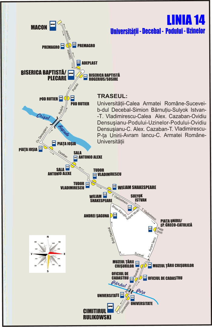 OTL anunță călătorii că în perioada 16 Iulie – 17 August 2018, din cauza lucrărilor de amenajare a unei treceri de pietoni denivelată la intersecţia str. Vasile Alecsandri cu str. Pc. 1 Decembrie, traseul liniei 14 de autobuz va fi modificat, pe sensul de mers spre Ioşia astfel: Universităţii – Calea Armatei Române – Sucevei – b-dul Decebal – Simion Bărnuţiu – Sulyok Istvan – T. Vladimirescu. De la staţia T. Vladimirescu traseul rămâne nemodificat până la Biserica Baptistă (Str. Podului). În perioada menţionată, staţiile de autobuz Biserica cu Lună, Parc şi Turnul Primăriei nu vor fi operationale, iar pe tronsonul modificat al traseului, autobuzele vor opri în staţiile Andrei Şaguna şi Sulyok István.