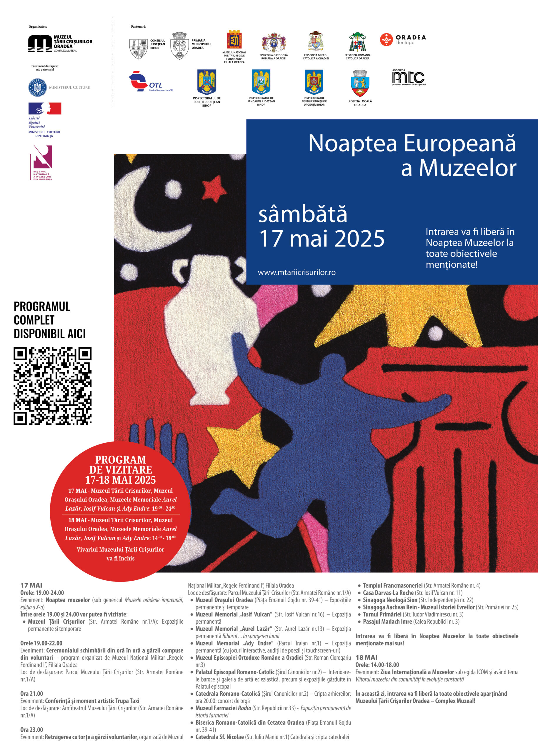 Pentru zilele de 17 și 18 mai 2025, programul muzeelor din subordinea Muzeului Țării Crișurilor Oradea – Complex Muzeal va fi următorul: