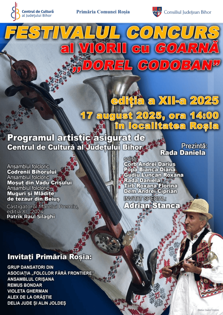 Festivalul-Concurs al Viorii cu Goarnă „Dorel Codoban” este unul dintre reperele culturale ale județului Bihor, aducând împreună comunitatea locală, artiștii și publicul iubitor de folclor autentic și încurajând transmiterea intergenerațională a unei tradiții muzicale rare. Publicul este invitat să fie parte din sărbătoarea sunetului bihorean, la Roșia, pe 17 august.