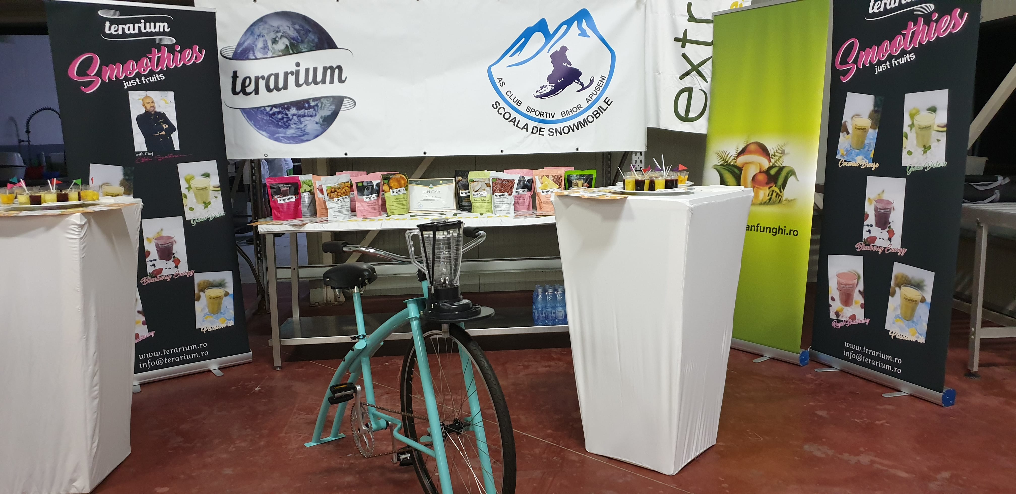 De asemenea, ca parte din conceptul Terarium, cei de la Emilian Funghi au realizat împreună cu producătorul de biciclete Pegas, o bicicletă statică de care au atașat un blender, astfel că prin pedalare îți poți face propriul smoothie! Ideea ingenioasă a fost deja îmbrățișată de partenerii spanioli ai firmei, care au dus-o pe plajele spaniole, bucurându-se de un real succes!