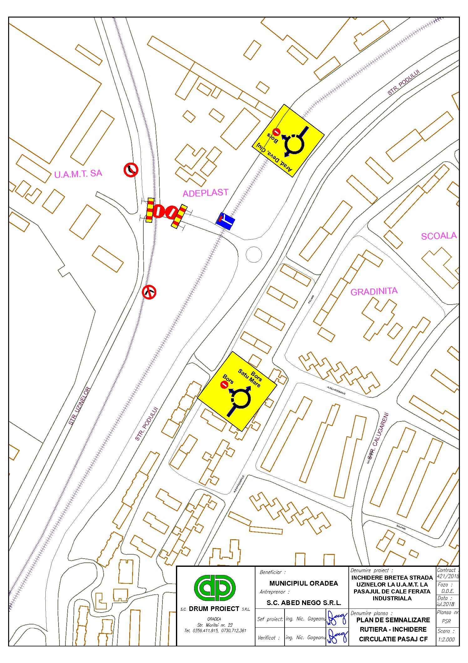 Lucrările se desfășoară conform contractului nr. 164512/04.04.2018, privind “Amenajare drum în zona intersecției calea ferată (între stațiile Episcopia Bihor – Oradea Vest) str. Uzinelor – str. Podului”, încheiat între Municipiul Oradea și SC Abed Nego Com SRL (proiectant-executant).